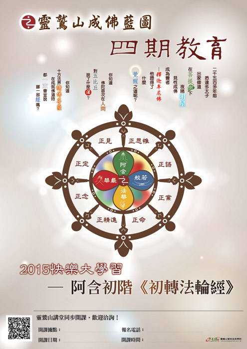2015年5月21日起,靈鷲山的「四期教育」課程在台灣各地講堂展開。「四期教育」指的就是將浩瀚的佛法整理成阿含期、般若期、法華期及華嚴期,讓更多人能夠清楚、有次第的學習,而四期教育的開場,就是阿含期。