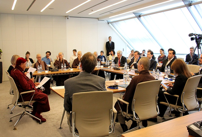 西方人提問向來單刀直入,不拐彎抹角,幾位年輕學者問道:「您如何跨越不同宗教領域,確實達成有效交流?」心道禪師提起十多年前的南亞大海嘯,無數難民居無定所,陷入困頓。靈鷲山發起聯合勸募,連結一貫道、台灣基督教長老教會、天主教明愛會等九個宗教團體共同募款,為斯里蘭卡災民建造屋舍。心道禪師表示:「跨宗教不是統一,也不是合併,而是以相互信任為基礎,尊重彼此的文化差異。就像是結交朋友一樣,大家先做朋友,再來共同成就。」
