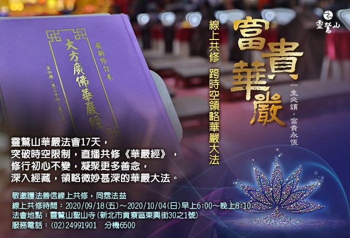 首頁 教育新訊 教育新訊 靈鷲山三乘佛學院 一0九學年度招生報名(簡章) 2020/07/03 靈鷲山三乘佛學院一0九學年度,即日起開始招生報名,報名至8月28日截止。本院依循佛陀本懷,重現那爛陀精神,以新世紀宗教大同的理念,培養三乘法門解行並重,工作與修行結合的國際弘法人才。 最新消息 8/8《經典開門》阿爸的靠山--觀音講座 歡迎報名! 2020/07/03 從小阿爸就是我們的靠山,那誰是阿爸的靠山呢?阿爸有苦說不出時,誰可以「聞聲救苦」聽見阿爸的心聲?阿爸有困難求救時,誰可以「隨所應化」幫助阿爸得解脫?阿爸有淚心害怕時,誰可以「施無畏」給予阿爸無懼勇氣? 教育活動 9/20原定《經典開門》課程異動公告 2020/07/02 原定9月20日 智慧人生 - 文殊心經,因與華嚴閉關撞期,故課程延期舉辦,實際時間將日後公告。 最新消息 7/25-7/26 南傳佛教思想史 國興老師邀您一起來上課 歡迎報名課程! 2020/07/01 非常難得能爭取到 國興老師的時間,讓老師來細說「南傳佛教思想史」,讓我們在南傳佛教的學習上,更上一層! 教育活動 解脫之門- Day1 【2020 靈鷲山 四期教育 阿含高階主題課程 解脫之門】 2020/06/24 心道法師說:「生命最好的禮物是煩惱,煩惱能使你打開智慧。」沒有最好的法門,只有最適合的法門。學員根據自己的因緣與根器來選擇適合的法門即可。包含四念住、四正勤、四神足、五根、五力、七覺支、八正道隨時隨地可修持,無論吃飯、走路、睡覺 學習分享 夏季僧眾禪十閉關--休歇止妄 現真心 2020/06/20 2020年6月8日-17日,在夏天啟開之初,靈鷲山僧眾進入十天的禪修閉關。從春季到現在新冠肺炎的疫情逐漸趨緩,我們有這十天的時間可以做一個短期的收攝。 學習分享 禪十啟關 心道法師勉老實坐禪 2020/06/19 靈鷲山四季僧眾閉關行之有年,一年4次關期讓僧眾得以休養生息,是僧眾策勵精進的關鍵時刻,也是宗風「慈悲與禪」的具體實踐。6月8日~6月17日啟建僧眾精進禪十閉關,百餘位僧眾收攝身心,深持禪修 學習分享 【EPL遇見與超越】系列三--聆聽心的對話 2020/06/08 從我十歲那年,全家三個人一起皈依靈鷲山。印象最深刻是剛皈依的時候,師父跟所有的信眾說我們要做一個志業,蓋一個很特別的博物館,叫做「世界宗教博物館」 學習分享 推薦發表 永無止盡的渴愛READ MORE「靈鷲山數位學習教育基金」 邀您一起來護持!READ MORE煩惱只是過路的影子READ MORE 延伸閱讀 9/9起 世界宗教博物館「我愛芳鄰」里民日ft. 『生命和平‧地球永續』--環保電影活動READ MORE11/7起 世界宗教博物館特展 「與神仙對話--道教與民間文學藝術展」歡迎參觀!READ MORE《隨喜齋僧離煩惱 供養三寶身莊嚴》 9/27、10/3 敬邀大眾隨喜齋僧!READ MORE《愛心贊普 造善積福》 2020 靈鷲山水陸法會 響應愛心贊普物資 嘉惠弱勢家庭團體READ MORE浩瀚廣博《華嚴經》 線上共修成佛道READ MORE 最前一頁上一頁3456789101112下一頁最後一頁
