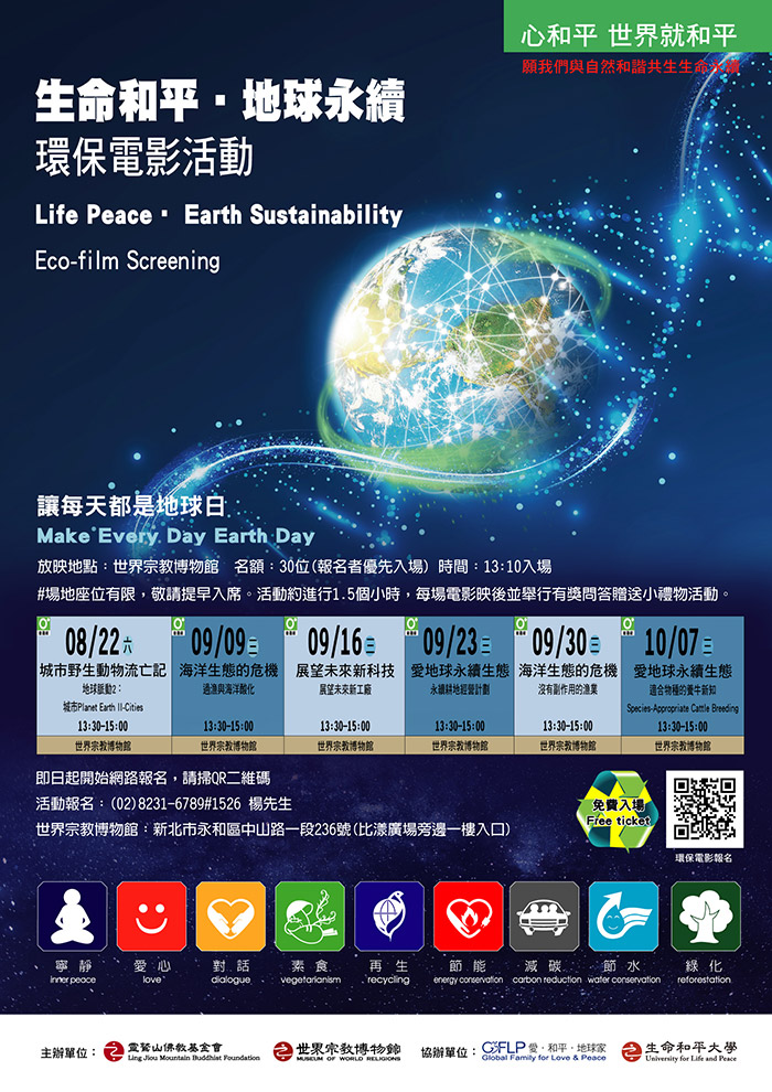 2020年第二屆『生命和平‧地球永續』--環保電影活動初夏於雙北展開,由靈鷲山佛教基金會、國立臺灣圖書館、世界宗教博物館聯合主辦,GFLP愛與和平地球家及生命和平大學協辦。今年預計舉辦超過20場,從7月8日(三)展開第一場活動。