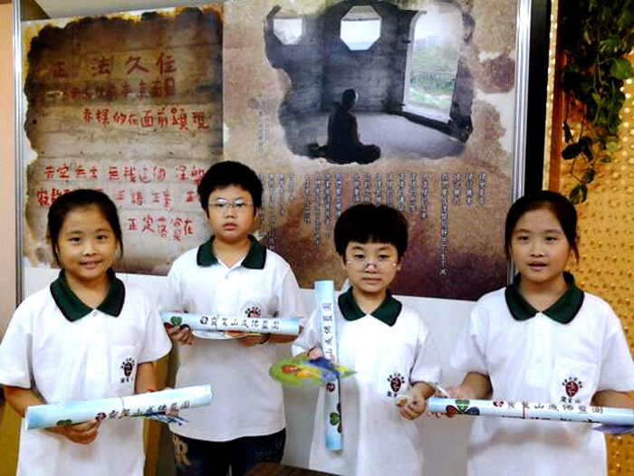 而水陸期間在靈鷲小學堂裡,也來了三個短期出家過的小朋友,為我們用巴利文念誦佛陀的九個名號,祝福四期教育推廣無礙,也祝福所有的學員們學習無所障礙!