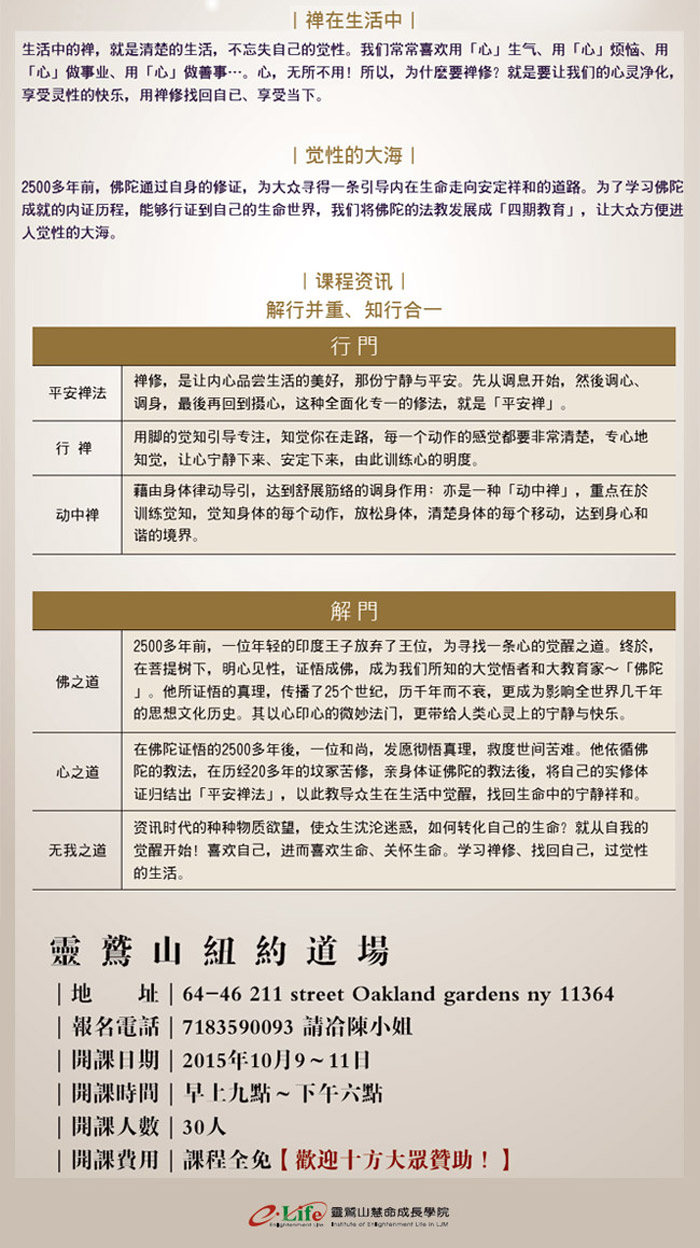 首頁 教育新訊 最新消息 訊息內容 10/9-11 紐約 阿含初階營隊課程 圖 / 慧命成長學院文 / 慧命成長學院 2015/09/11 >> 下載營隊課程報名表 9/25-27 馬來西亞 阿含初階營隊課程 上一篇 2015年度各區講堂課程 平安一日禪 下一篇 推薦發表 永無止盡的渴愛READ MORE「靈鷲山數位學習教育基金」 邀您一起來護持!READ MORE煩惱只是過路的影子READ MORE 延伸閱讀 靈鷲山四期教育【阿含期】初階--初轉之法 線上課程 即日起開始報名READ MORE靈鷲山佛教教團敬祝大家 中秋佳節愉快READ MORE9/18-10/4 靈鷲山華嚴法會啟建 歡迎報名READ MORE2020「平安禪法課程」 歡迎報名READ MORE9/18-10/4 靈鷲山華嚴法會 推全球直播共修READ MORE