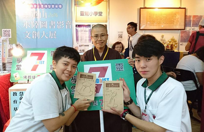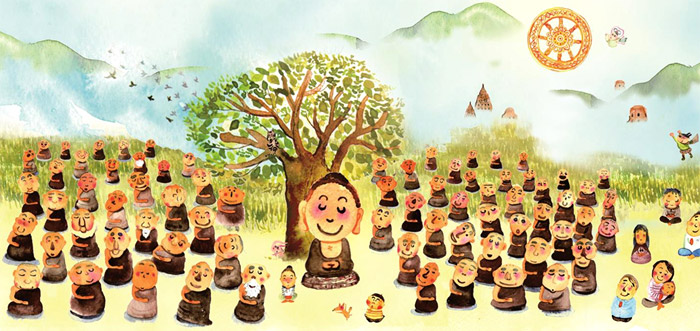 許多海內外的朋友們,都非常喜愛馥伶老師的作品。其中一幅500僧眾於菩提樹下學習四期教育的圖像,張貼在慧命成長學院的教室裡,陪伴學員一同成長。又有些生動活潑的圖案,結合心道禪師法語,設計為文創商品,由般若書坊發行。看到這些豐富精美的作品,以及可愛的【靈鷲小沙彌】,著實引人好奇,馥伶老師的創作靈感都是從哪裡來的呢?