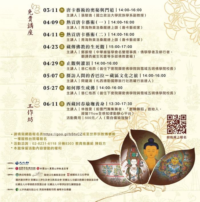 首頁 教育新訊 教育活動 訊息內容 04/09-07/09「洛桑龍達上師‧青海熱貢唐卡藝術展」系列教育活動 圖 / 世界宗教博物館文 / 世界宗教博物館 2017/03/13 世界宗教博物館「洛桑龍達上師‧青海熱貢唐卡藝術展」,04/09-07/09展覽期間,於03/11-06/11舉辦一系列的免費講座及工作坊,歡迎有興趣的觀眾朋友們,一起報名參加! >> 觀看活動詳情 2017/4/15-5/7 靈鷲山大悲閉關21 邀您一起來參與 即日起開始報名 上一篇 4/15、7/29「我是小小建築師」親子體驗營 看建築‧玩積木‧遊世界 即日起歡迎報名參加! 下一篇 推薦發表 永無止盡的渴愛READ MORE「靈鷲山數位學習教育基金」 邀您一起來護持!READ MORE煩惱只是過路的影子READ MORE 延伸閱讀 7/25-7/26 南傳佛教思想史 國興老師邀您一起來上課 歡迎報名課程!READ MORE世界宗教博物館19周年 跨宗教祈福與道教特展同賀READ MORE12/27 南傳佛教課程--生活中的「阿毘達摩」 歡迎報名!READ MORE10/17、10/18《法句經》專題課程 歡迎報名READ MORE《愛心贊普 造善積福》 2020 靈鷲山水陸法會 響應愛心贊普物資 嘉惠弱勢家庭團體READ MORE