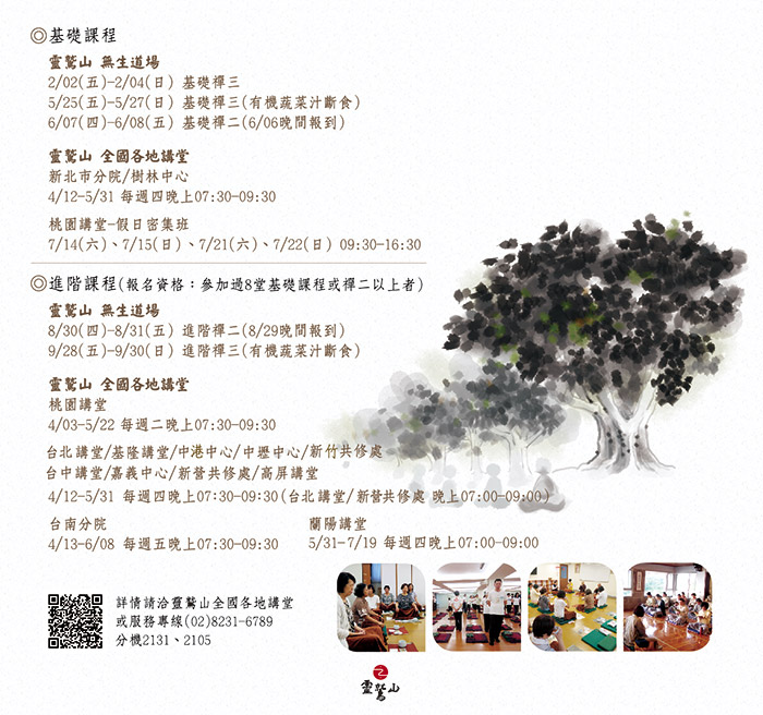 首頁 教育新訊 最新消息 訊息內容 平安禪法課程(全年度) 歡迎與各區講堂報名,一起沉澱、充電再出發!! 圖 / 慧命成長學院文 / 慧命成長學院 2018/01/08 平安禪法,不僅提升自我反省觀照的能力,漸次達到內心清明,並可讓自己隨時都處於一個內心平靜和諧、心靈愉悅平安的狀態。 趕快和講堂報名,讓自己沉澱、充電再出發!! 電話報名:請洽詢靈鷲山各區講堂 【慧命成長學院】01/27(六)《地藏經》經典專題講座 邀您一起來深入經藏 歡迎報名! 上一篇 1/11起 【阿含期進階】主題課程:無我之道 (後四堂) 下一篇 推薦發表 永無止盡的渴愛READ MORE「靈鷲山數位學習教育基金」 邀您一起來護持!READ MORE煩惱只是過路的影子READ MORE 延伸閱讀 2020《經典開門》系列講座:智慧人生~照見心經 11/21開講,歡迎報名!READ MORE9/18-10/4 靈鷲山華嚴法會啟建 歡迎報名READ MORE2020靈鷲山平安一日禪 歡迎報名READ MORE浩瀚廣博《華嚴經》 線上共修成佛道READ MORE2020「平安禪法課程」 歡迎報名READ MORE