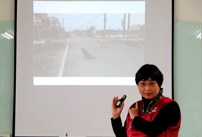 投影片上有張照片為例:那是宋老師家的狗,一黃一黑(姑且稱之為大黃、小黑)。有天,宋老師要遠行,託鄰居幫忙照顧一下。而鄰居是位特教老師,家裡也有飼養兩隻狗,其中有一隻名為土匪。