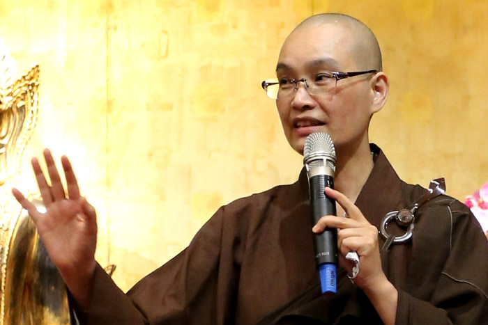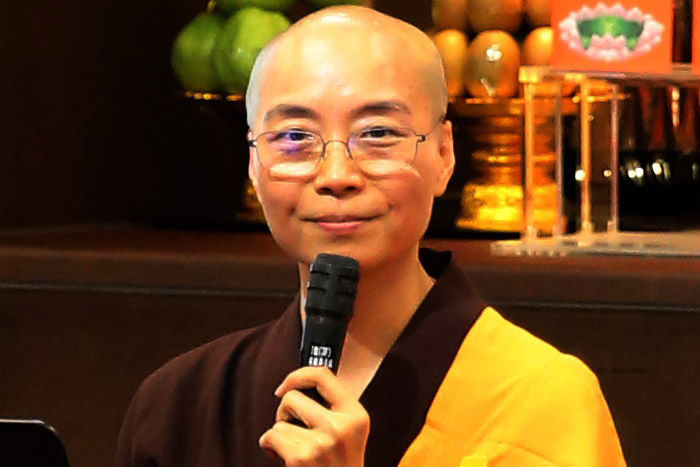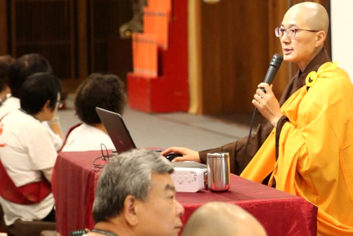第2天由法用法師講述「二愛」。深度與廣度兼具地說明師父「從戰場到墳場、從墳場到道場」的度眾濟世,打開弟子們的宏觀視野,重申佛陀不捨眾生的菩提心,在「地球的平安,決定在人心」中,讓大悲咒連結了多元和諧的眾生心。