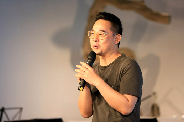 繪本畫家幾米上台致詞,訴說近3年跟著林健成老師學雕塑,讓他重溫當學生的樂趣,也豐富他的創作題材與風格,他發現林老師嚴肅的創作風格下,其實是充滿童心的純真,培養出兩人亦師亦友般的忘年之交情感,感動在場所有與會貴賓。