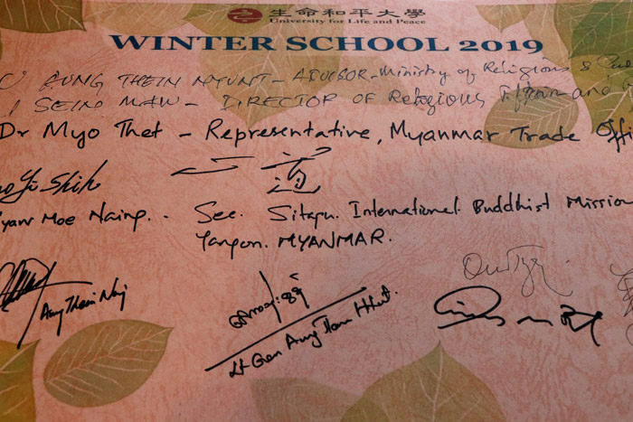 生命和平大學冬季實驗學校是靈性價值與科學合作的教育里程碑,10位專業領域的國際知名教授遠從世界各地而來,為了愛地球、愛和平的共同理念和對地球平安的責任感相聚在仰光,透過小組授課分享,讓學生互相學習,兩週的共同學習時間,以期結合各方智慧,形成愛地球的實踐方略。