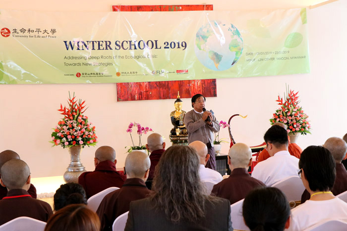 10日的開幕式,先以緬甸傳統樂器豎琴登場,讓樂音帶來祝福與和平,最後孔雀開屏舞象徴冬季學校圓滿順利,開幕現場貴賓雲集包括:緬甸巴利大學校長鳩摩羅尊者Kumara、緬甸大將軍Phone Myat、緬甸駐台辦事處代表明佑特、宗教與文化部副司長U Aung Thein Nyunt、仰光省宗教與文化部局長U Sein Maw、仰光省前書記U Khin Maung Htun等人都到場祝福,多位教授和學員來自全球四面八方,大家激盪出很多關懷地球生態的火花。